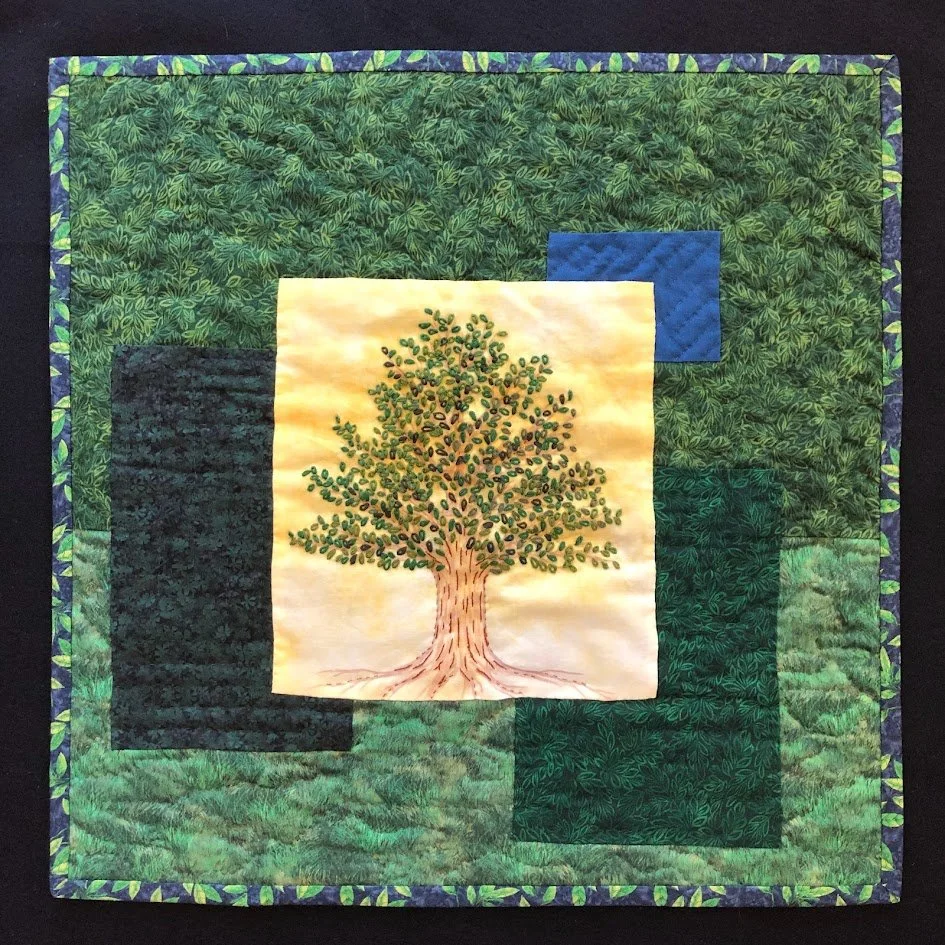 I began traditional quilting to use up fabric scraps, but soon transitioned to creating art quilts that capture ideas and stories. To better communicate in fiber, I have learned embroidery, fabric dyeing, various surface design techniques, weaving, felting, knitting, and most recently, Indigo dyeing.