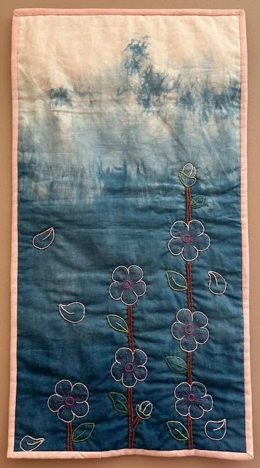 "Indigo II: Sakura" Created by Hilary Cannon Anderson Hand embroidery on hand-dyed Indigo fabric. Bloomington, Indiana. In the Williams Family collection.